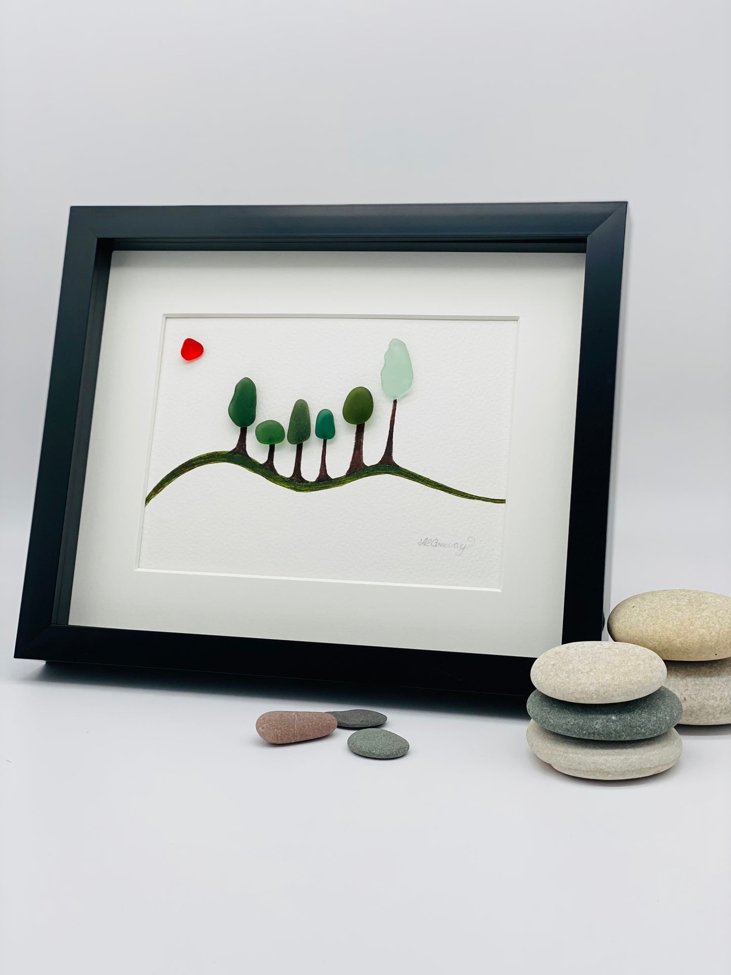 The stones are applied to heavy weight watercolour paper, mounted and framed, ready to be displayed proudly in your home.